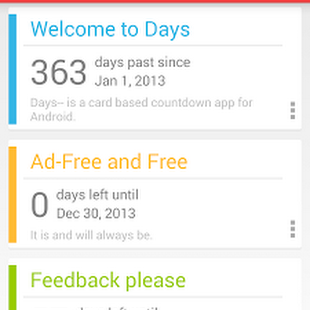Did you ever have an important date to remember? Have you ever felt adding an all-day event is too heavy for it, while you did want something you can easily check and never get lost? Days– is a beautiful countdown app using the popular card-based UI introduced by Google. It is designed to be an efficient as well as elegant tool for your Android device.