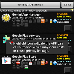 Task kill function is used to end applications, freeup memory (RAM), stop traffic/battery consuming from unnecessary apps to improve performance of device. Support one key RAM optimize, kill by selection, and Force Kill (need ROOT);