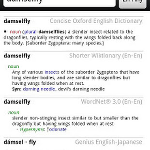 The fastest and most multi-format dictionary app on the market. Fully supports Lingvo, Babylon, StarDict, Lingoes and Dictd dictionary files. Articles shown with full formatting, colors, images and sounds. Lookups are blazing fast. You can now carry all the dictionaries you want together with you on your Android device!