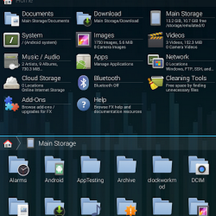 * Productivity-oriented layout: The “Home Screen” shows bookmarks, storage, tools and (with FX+) media/network locations. You no longer have to wade through the garbage that apps store in the root folder of your SD card to get to the places you actually use.